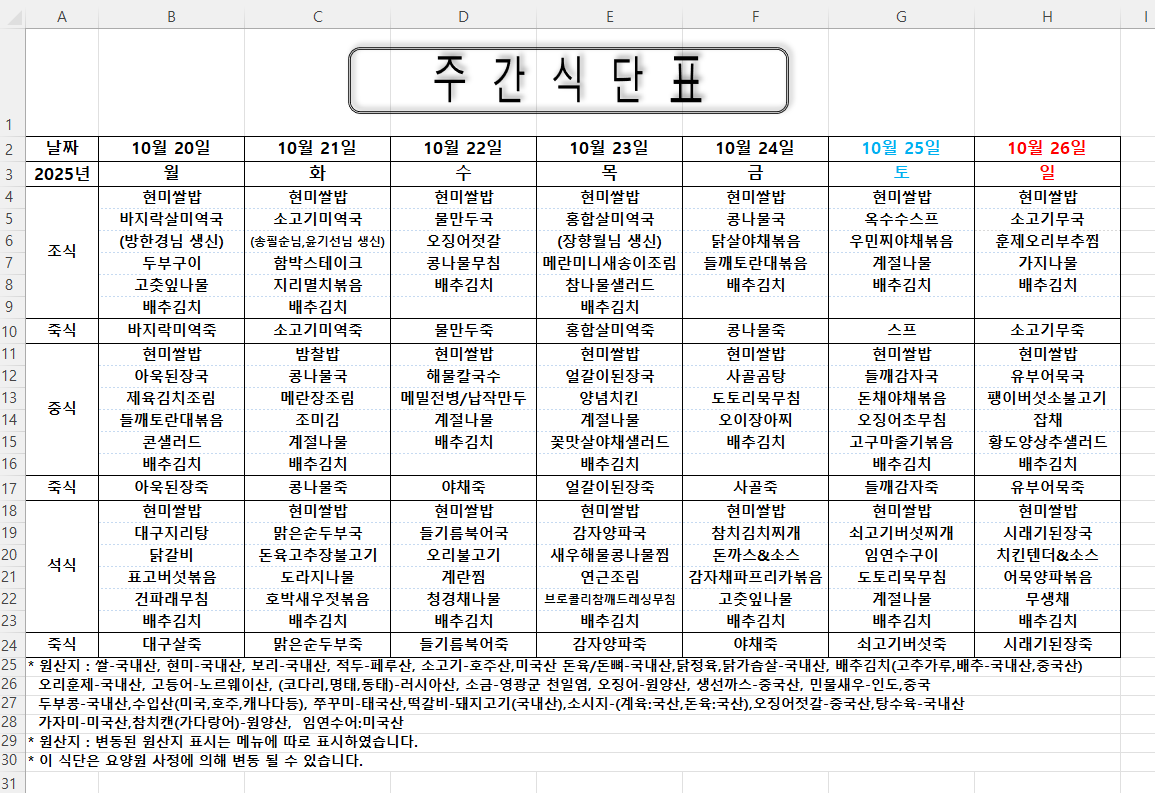 주간식단표 (2025.10.20 ~ 2025.10.26)