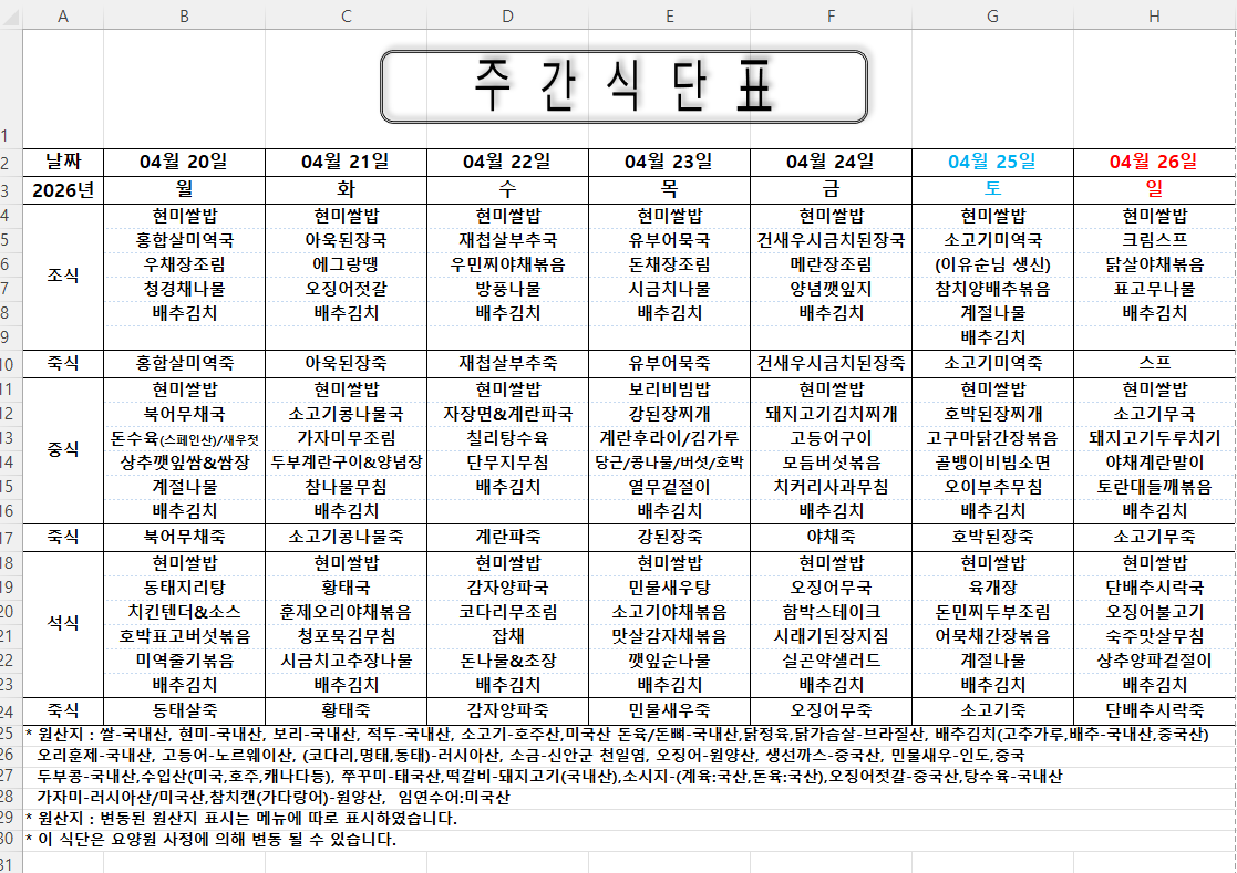 주간식단표 (2026.04.20 ~ 2026.04.26)
