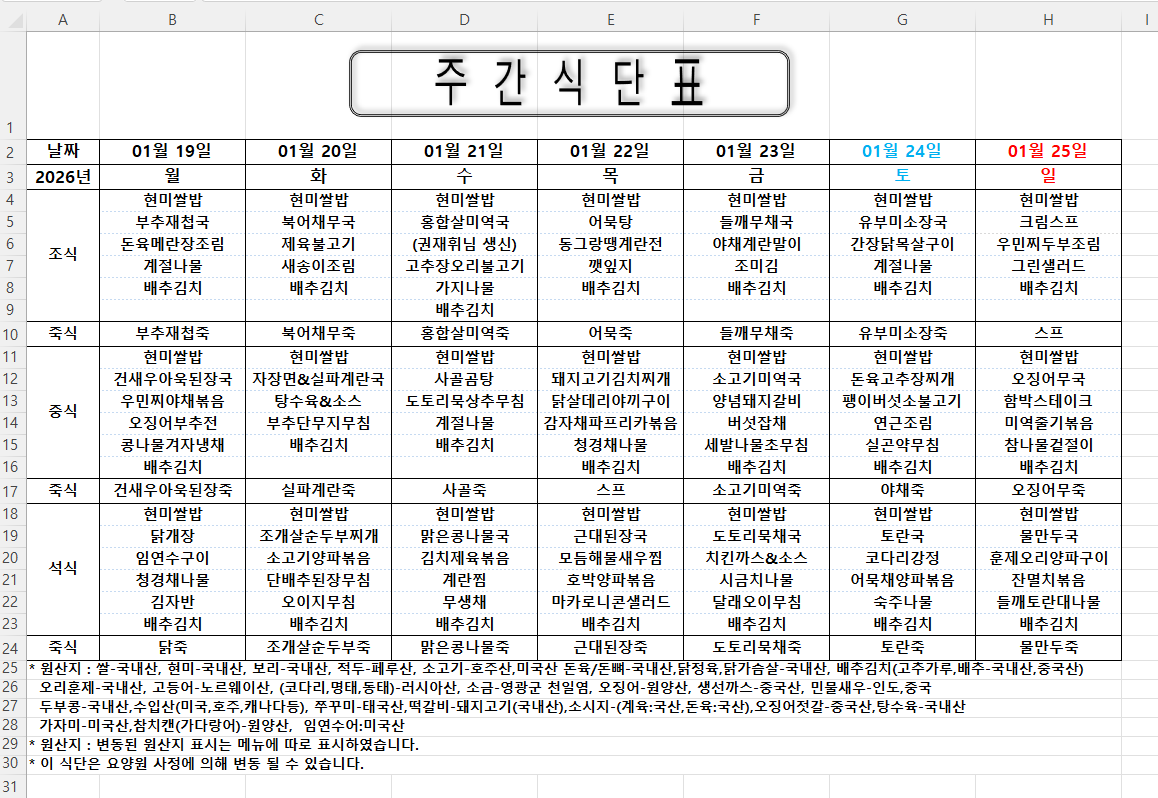주간식단표 (2026.01.19 ~ 2026.01.25)