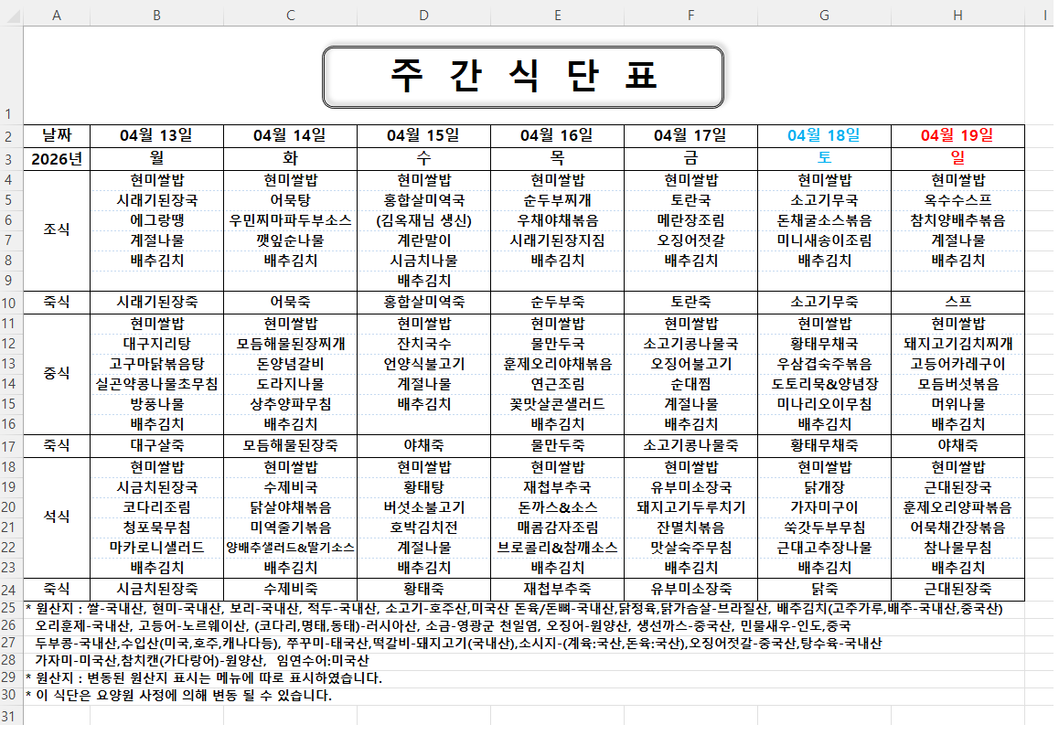 주간식단표 (2026.04.13 ~ 2026.04.19)