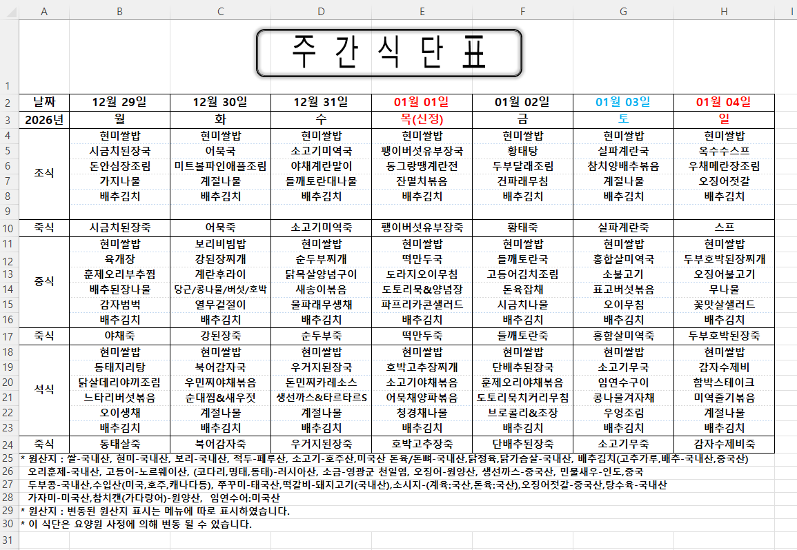 주간식단표 (2025.12.29 ~ 2026.01.04)