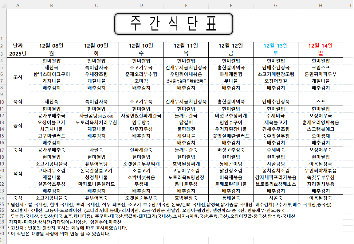 주간식단표 (2025.12.08 ~ 2025.12.14)