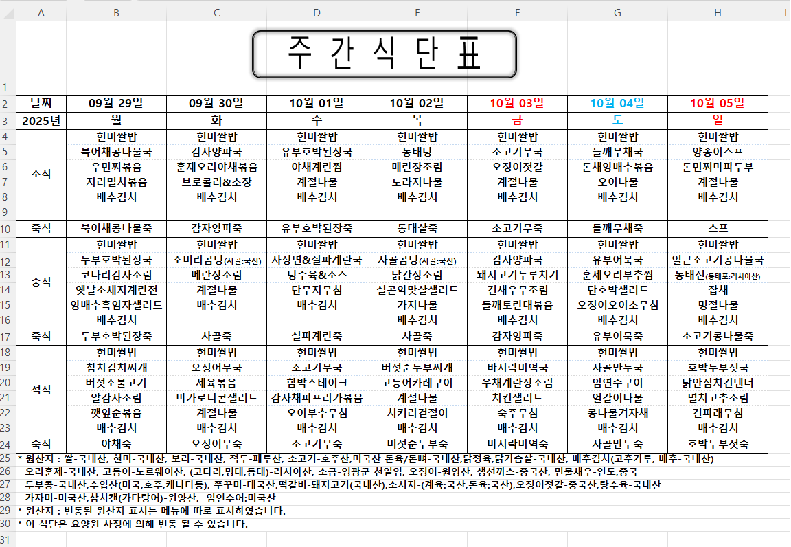 주간식단표 (2025.09.29 ~ 2025.10.05)