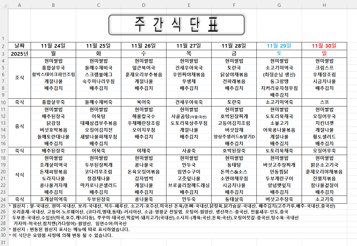 주간식단표 (2025.11.24 ~ 2025.11.30)