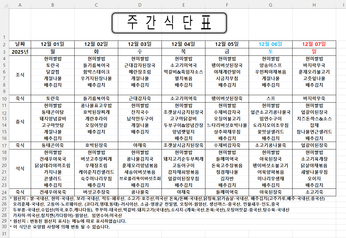 주간식단표 (2025.12.01 ~ 2025.12.07)