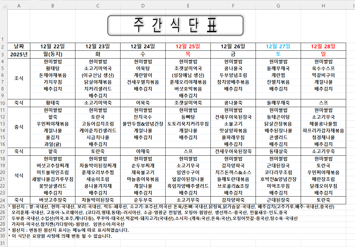 주간식단표 (2025.12.22 ~ 2025.12.28)