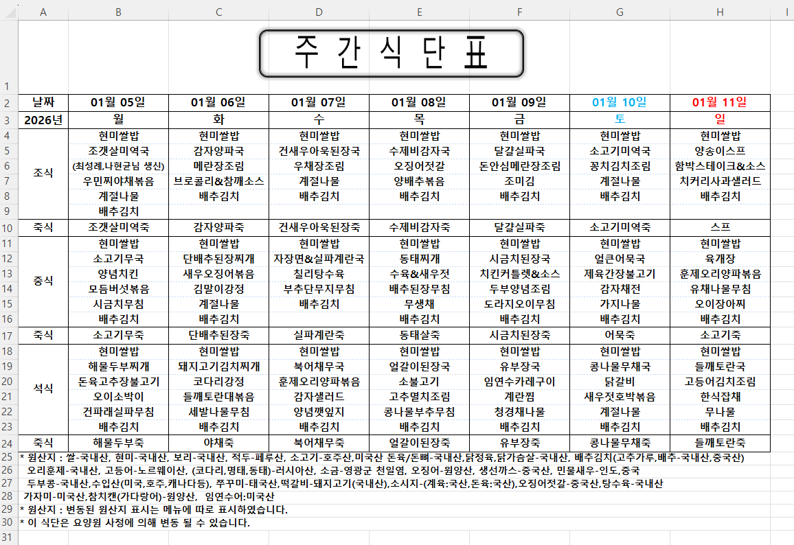 주간식단표 (2026.01.05 ~ 2026.01.11)