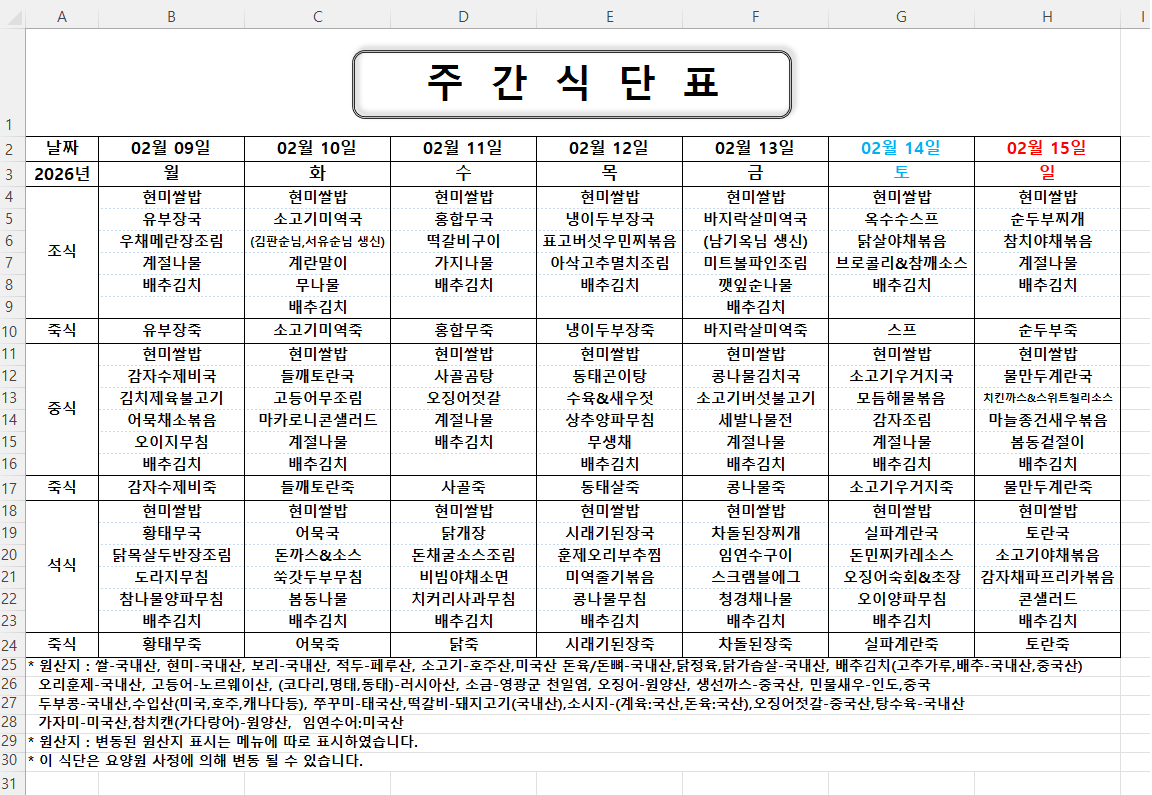 주간식단표 (2026.02.09 ~ 2026.02.15)